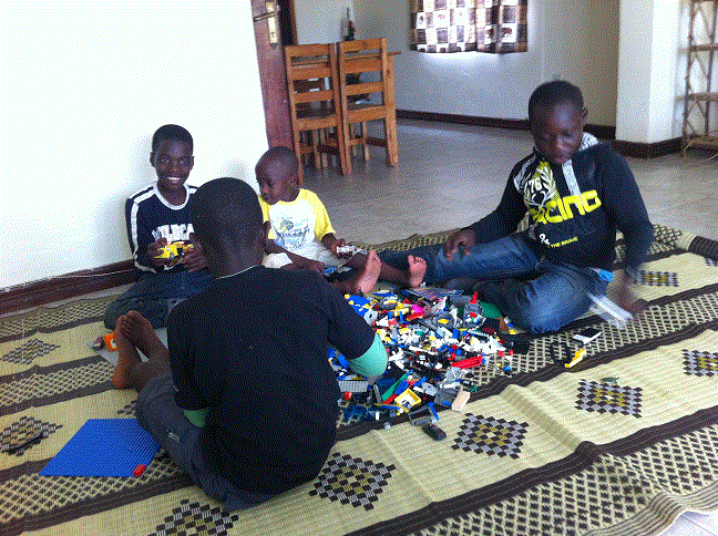 Ivan, Tugume, Buddha och Irenes son Ronnie stannade hemma medan resten gick till fotbollsplanen. perfekt tillfälle att introducera LEGO. De tycker det är jättekul och har suttit i flera timmar nu. Stort TACK till Tess och ni andra som skänkte LEGO till grabbarna. Mycket, mycket uppskattat!
