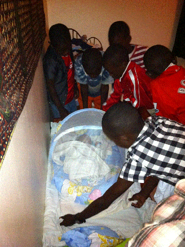 Den provisorisk sängen består utav en soffa som vi vänt inåt en vägg. I den har vi lagt madrass, filtar och en liten bebiskupa med myggnät som han sover i. Han har kläder för nyfödda.