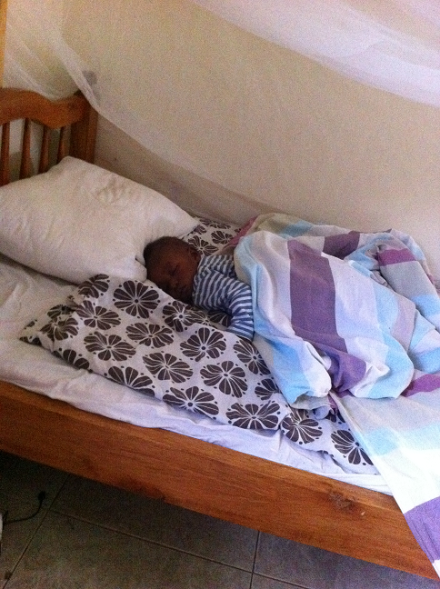Ha ha, nej det har han inte. Men han slocknar lite varstans på dagarna och ibland vill vi inte väcka honom för att flytta honom. På nätterna sover han alltid i sin egen säng dock.
