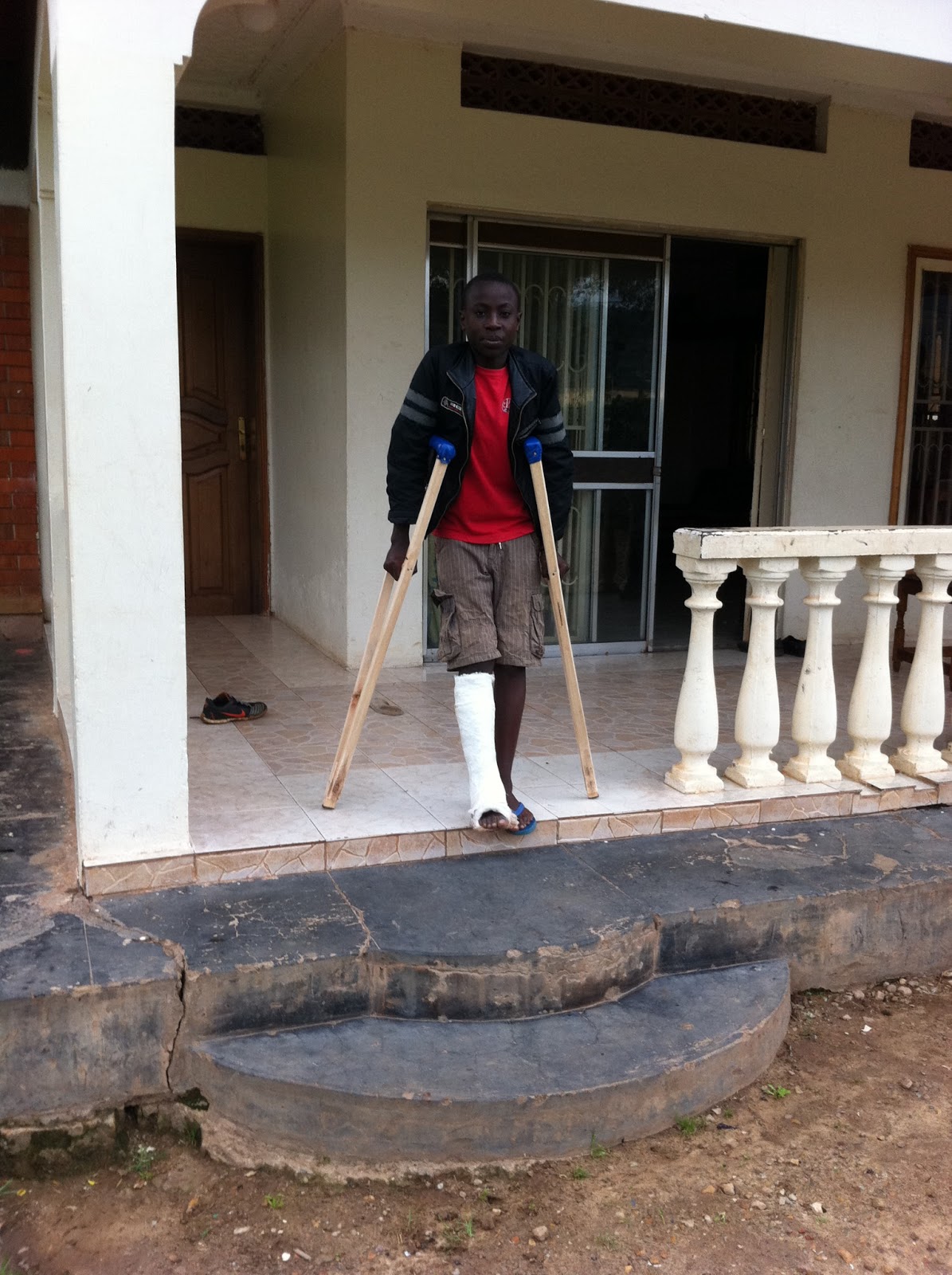 Det var minst sagt annorlunda att spela på en lutande plan med träd och gropar lite överallt men det stoppade inte grabbarna som vann med 2-1. Tyvärr resulterade matchen också i en fotskada för Ayebare. Han har fått en liten fraktur och måste nu gå gipsad. Det hade såklart kunnat hända varomhelst, men visst ökar risken för skador när man spelar på en sådan plan, därför har vi bestämt att vi ska stå på oss nästa gång och insistera på annan plan.