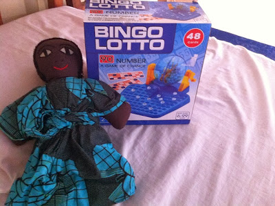 Vår söndagstraditon BINGO har haft ett ofrivilligt uppehåll sen flera nummerkulor försvunnit och en av grabbarna råkade ha sönder ”blandaren”. Det ska det bli ändring på nu. Gissa om jag blev glad när jag fann det här spelet i Dar es Salaam.