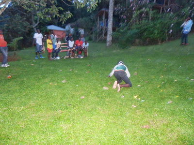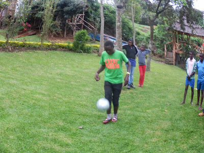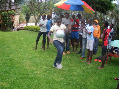 | Nästkommande tävlingar var fotbollsrelaterade. Först körde vi trix med boll. Här Tugume… |