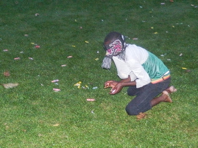 | Vi spred ut en massa godis på gräsmattan. Knöt en halsduk för ögonen på dem en efter en och gav dem sedan en minut vardera att leta upp så många ”skatter” som möjligt. |
